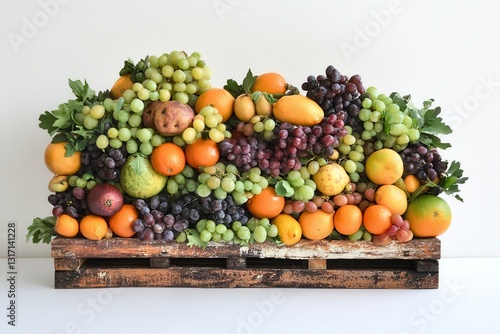 A vibrant display of assorted fruits arranged on a rustic wooden pallet against a clean backdrop