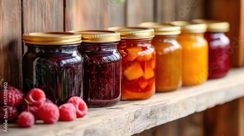 A vibrant display of assorted homemade jams in jars, neatly lined on a rustic wooden shelf, showcasing the rich colors and textures of each unique flavor.