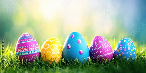 A vibrant display of Easter eggs arranged neatly on lush green grass, illuminated by warm sunlight, capturing the essence of spring festivities.