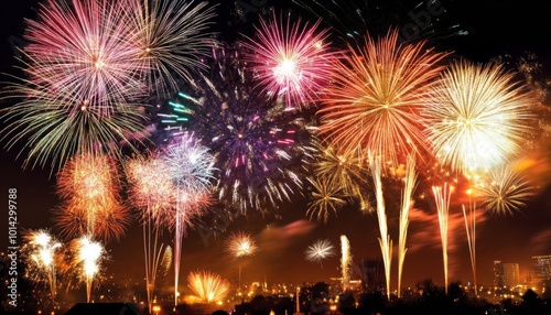 A vibrant display of fireworks explodes in the night sky above a cityscape.