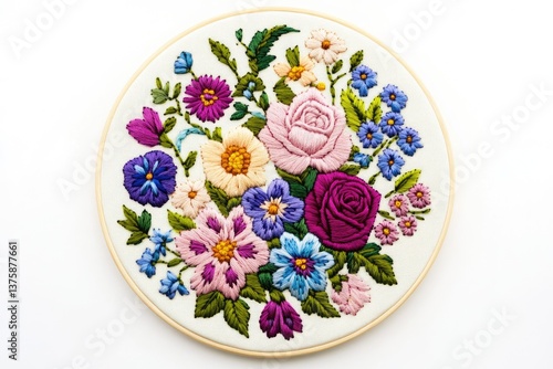 A vibrant embroidery hoop showcasing a meticulously stitched floral bouquet with roses, pansies, and other blossoms.