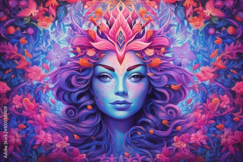 A vibrant, ethereal portrait of a woman surrounded by floral elements.