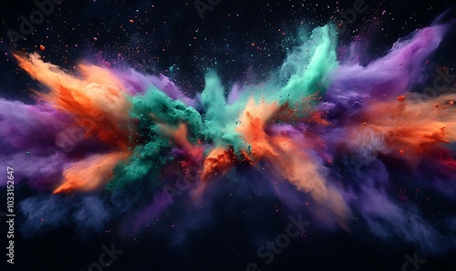A vibrant explosion of color swirls against a dark background, showcasing dynamic blends of purple, orange, green, and blue, evoking a sense of creativity and energy.