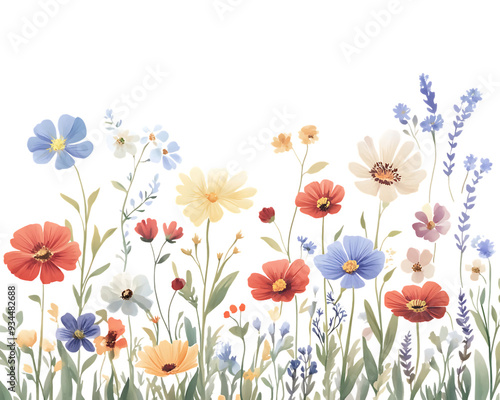 A vibrant field of colorful wildflowers, blooming in abundance. Red, yellow, blue and white blossoms create a stunning display of nature's beauty.