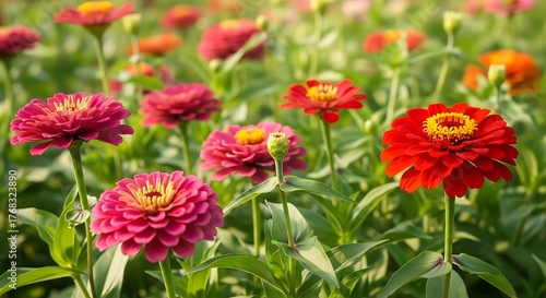 A vibrant field of colorful zinnia flowers in full bloom on a sunny day