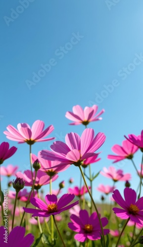 A vibrant field of pink cosmos flowers stretches towards a clear, bright blue sky, capturing the essence of a perfect summer day.