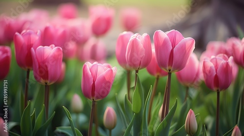 A vibrant field of pink tulips in full bloom, showcasing their delicate petals and lush green leaves in a serene outdoor setting.