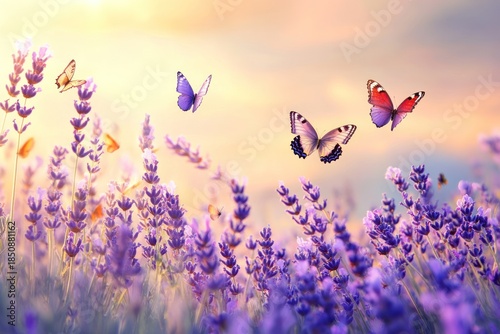 A vibrant field of purple flowers under a warm sunset sky, with butterflies fluttering around the blooms.