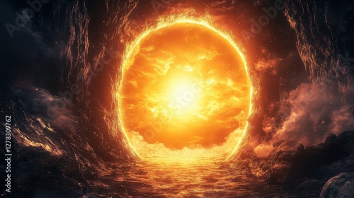 A vibrant, fiery portal illuminates a surreal landscape, casting warm light over dark rocky formations and shimmering water below.