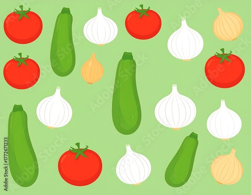 A vibrant, flat-style illustration featuring an assortment of fresh vegetables on a green background