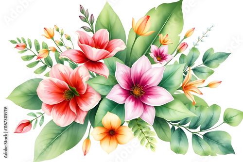 A vibrant floral arrangement featuring pink and white hibiscus flowers with lush green leaves on a white background. Greeting or wedding card decoration.