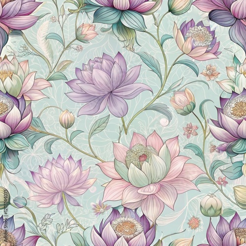 A vibrant floral pattern featuring various lotus flowers in soft pastel colors against a light background.