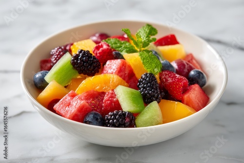 A vibrant fruit salad featuring a variety of fresh fruits including watermelon, berries, and citrus. The colorful mix is garnished with mint leaves and presented in a bowl on a marble surface