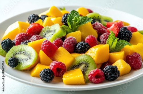 A vibrant fruit salad with juicy berries, mango,