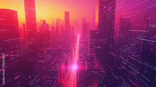 A vibrant futuristic cityscape bathed in neon hues of pink and orange, showcasing towering skyscrapers and glowing gridlines. The image captures the essence of a digital metropolis, blending modern