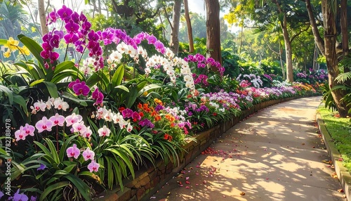 A vibrant garden path curves through a blooming display. Orchids cascade in hues of pink, purple, and white, alongside green foliage