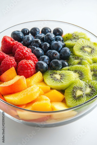 A vibrant glass bowl filled with colorful and fresh fruits: blueberries, raspberries, kiwi slices, and peaches, arranged beautifully for a healthy treat.