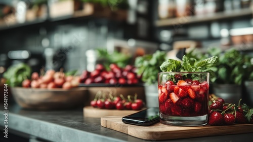 A vibrant glass of mixed berry juice garnished with mint rests on a kitchen countertop, showcasing freshness and the joy of culinary creativity in daily life.
