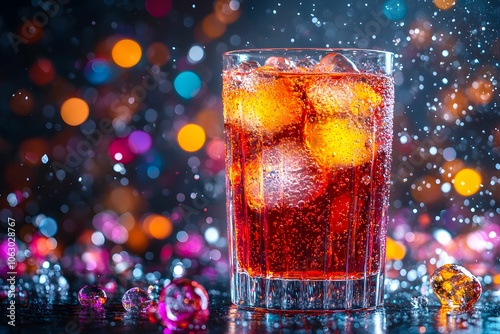 A vibrant glass of sparkling soda with ice, surrounded by colorful bokeh lights and water droplets.
