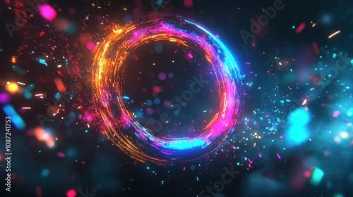A vibrant, glowing circular design with colorful particles and light effects.
