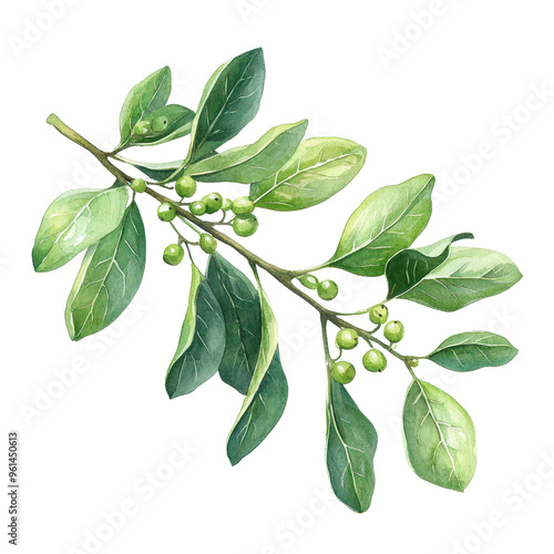 A vibrant green branch featuring lush leaves and small berries, perfect for nature-themed designs and botanical illustrations.
