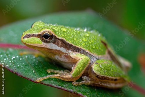 A vibrant green frog rests on a lush leaf, showcasing intricate skin texture and glistening dew droplets in a macro nature portrait.