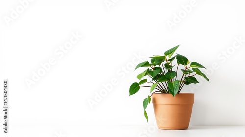 A vibrant green houseplant in a terracotta pot sits against a clean white background providing a minimalist aesthetic.