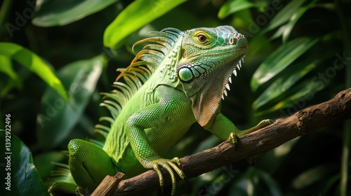 A vibrant green iguana perches on a branch, displaying its textured skin and distinctive dewlap. Lush foliage surrounds the reptile