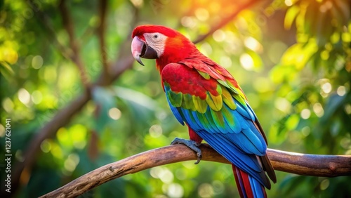 A vibrant green winged macaw with brilliant bright plumage perches proudly on a sturdy tree branch, its feathers glistening in the sunlight , wildlife, plumage
