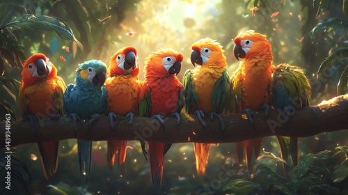 A vibrant group of colorful parrots perched on a branch in a lush forest.