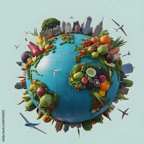 A vibrant healthy planet earth adorned with fresh fruits and vegetables symbolizing global agriculture sustainability and a flourishing ecosystem with airplanes flying around