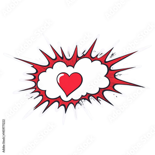 A vibrant illustration of a cloud with a heart in the center, surrounded by explosive red accents on a soft pink background