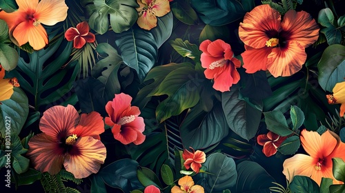 A vibrant image of lush tropical foliage and blooming flowers wallpaper.