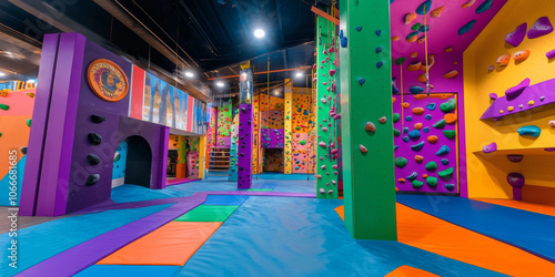 A vibrant indoor rock climbing gym with climbers tackling colorful walls, showcasing strength and adventure