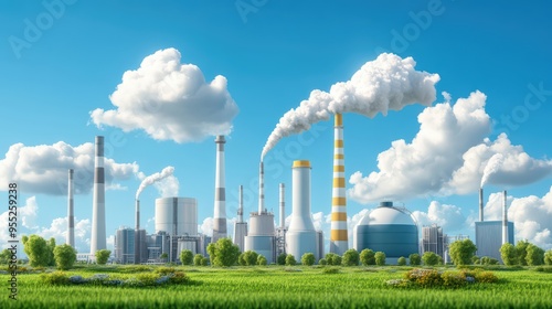 A vibrant industrial landscape with smokestacks and green fields under a clear blue sky, showcasing modern manufacturing and nature.