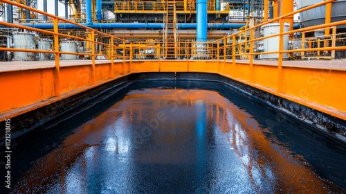 A vibrant industrial scene showcasing a dark, reflective surface surrounded by bright orange railings and blue pipes in a manufacturing facility.