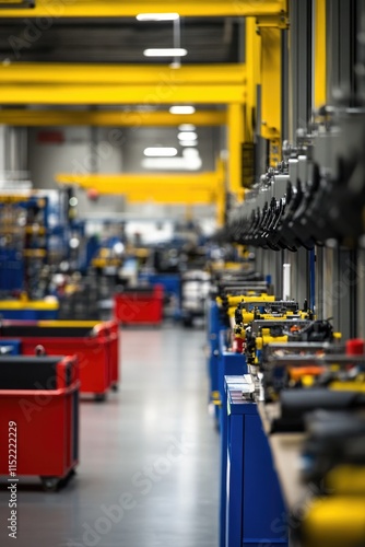 A vibrant industrial workspace with tools and equipment organized along a production line.
