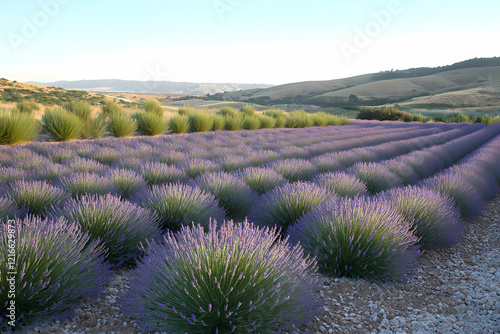 A vibrant lavender field stretching endlessly to the horizon, bathed in soft sunlight. The scene embodies tranquility, natural beauty, and perfect harmony with the environment