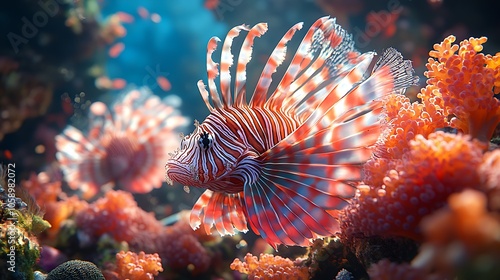 A vibrant lionfish with its fins spread out, swimming among colorful coral reefs in a sunlit underwater scene.