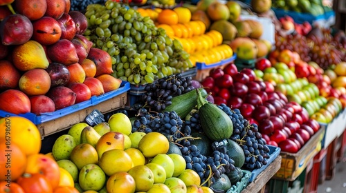 A vibrant market stall showcasing a wide variety of fresh produce, including mangoes, grapes, apples, and more. Generative AI