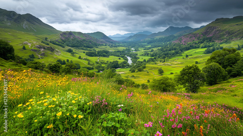 A vibrant meadow foregrounds a valley landscape with overcast sky.