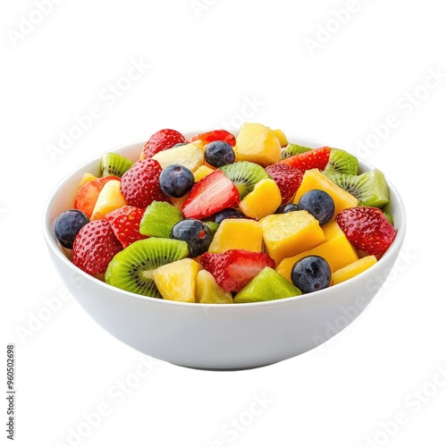A vibrant mix of fresh, juicy fruits, including strawberries, kiwi, mango, and blueberries, creates a tempting fruit salad in a white bowl.