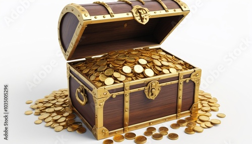 A vibrant model of a treasure chest overflowing with gold coins and jewels displayed on a bright white surface, embodying the thrill of adventure in gaming, Generative AI