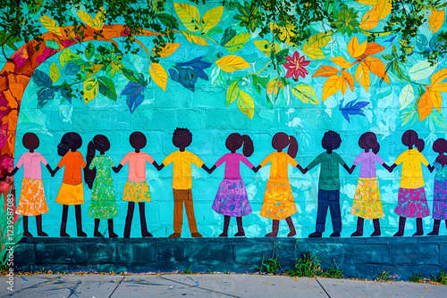 A vibrant mural depicting children holding hands under a leafy tree, symbolizing unity and community.
