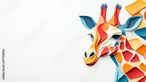 A vibrant paper art representation of a giraffe, showcasing colorful layers and a creative design against a minimalistic background.