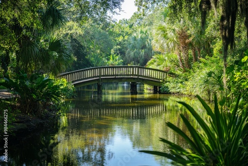 A vibrant park filled with lush greenery, featuring a charming wooden bridge crossing over a serene stream, surrounded by various tropical plants and trees.