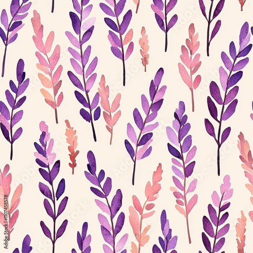 A vibrant pattern featuring watercolor leaves in shades of purple and pink against a light background, for textiles or decorative use.