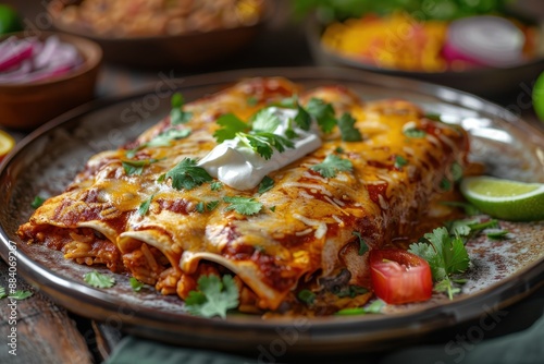 A vibrant plate of chicken enchiladas topped with melted cheese, garnished with fresh cilantro and a drizzle of sour cream, served with a side of Mexican rice and refried beans.