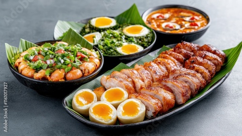 A vibrant platter of Asian dishes featuring meats and vegetables.