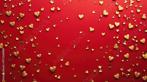 A vibrant red canvas with gleaming golden hearts, creating a cheerful, romantic, and festive vibe, perfect for holiday or Valentine Day decoration